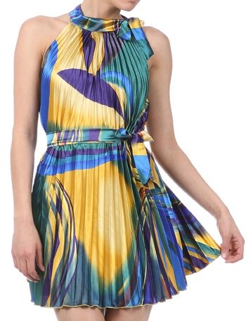 Satin Pleated Sleeveless Two Tone Short / Mini Dress with Multi Color Swirl Design ( 3 Colors ) - Clearance Sale ! Feature